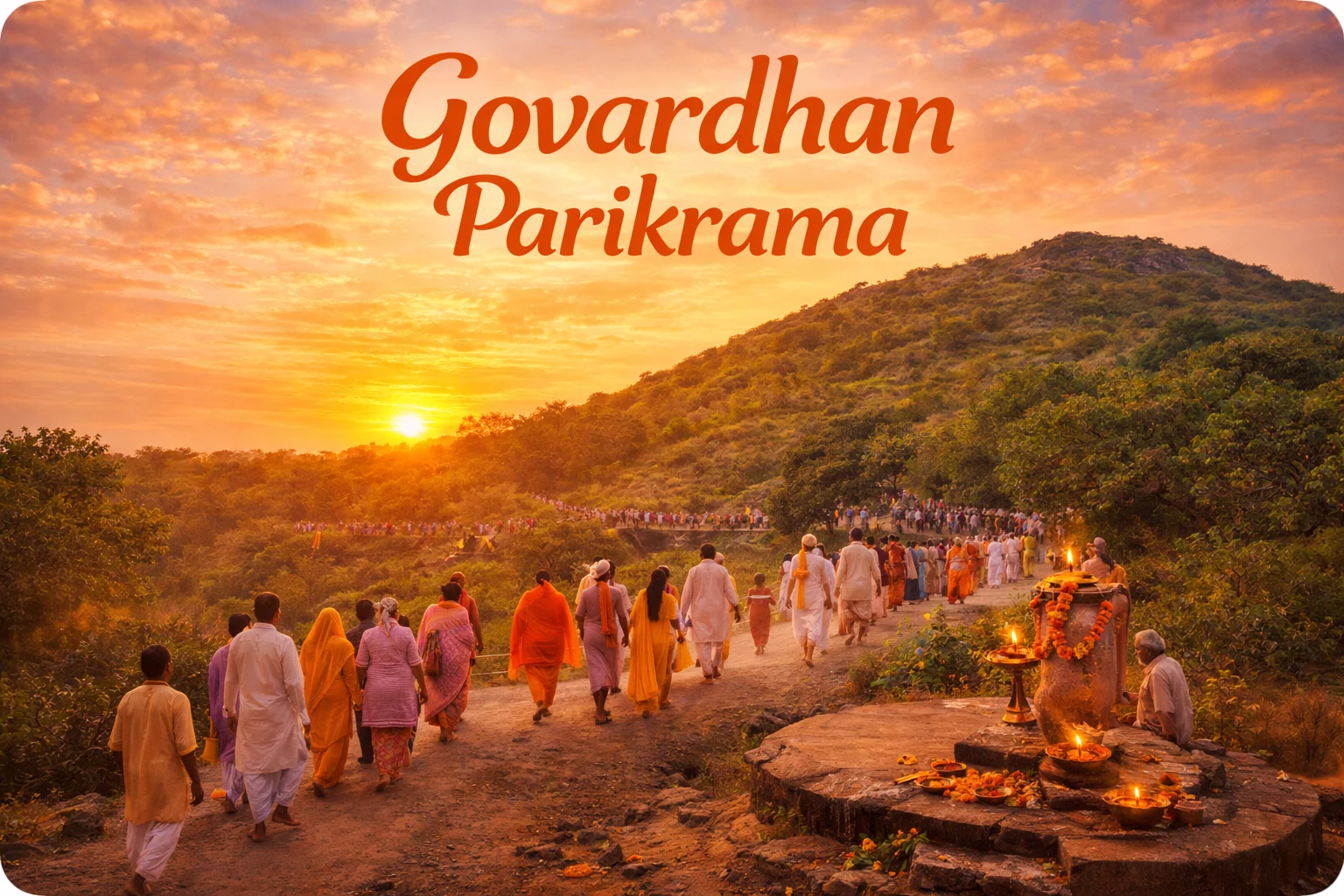 Sacred Govardhan Hill Parikrama with proper halts, meals, and spiritual flow.